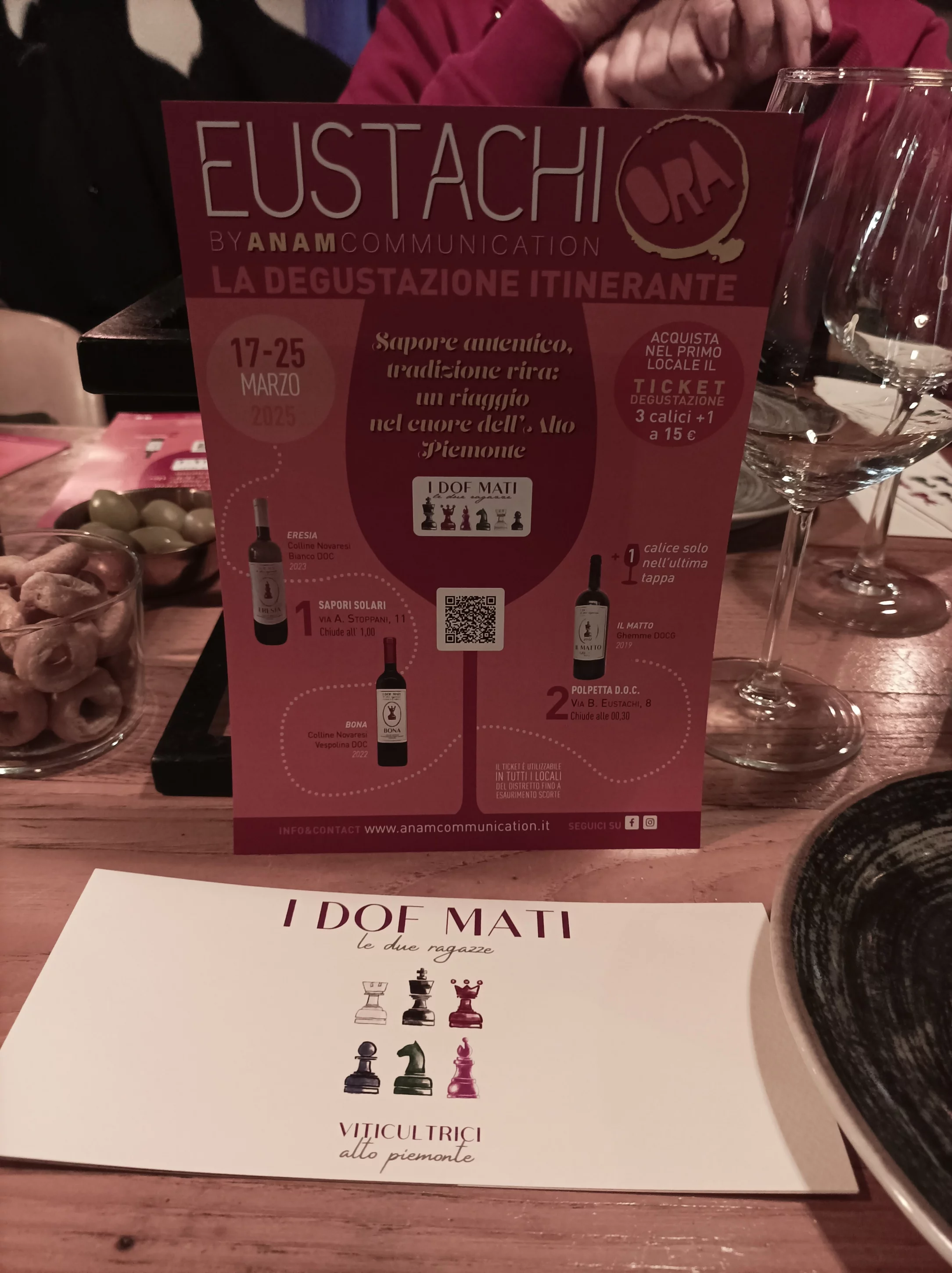 Il terzo momento del gusto è la degustazione itinerante di Eustachiora, tornata rinnovata con l’offerta di tre vini in due locali e non più tre, ma sempre con l’idea di condividere e valorizzare la cultura del vino: ciò è accaduto presso Sapori Solari e Polpetta Doc, in compagnia della Cantina I Dof Mati di Fara Novarese, nell’Alto Piemonte.