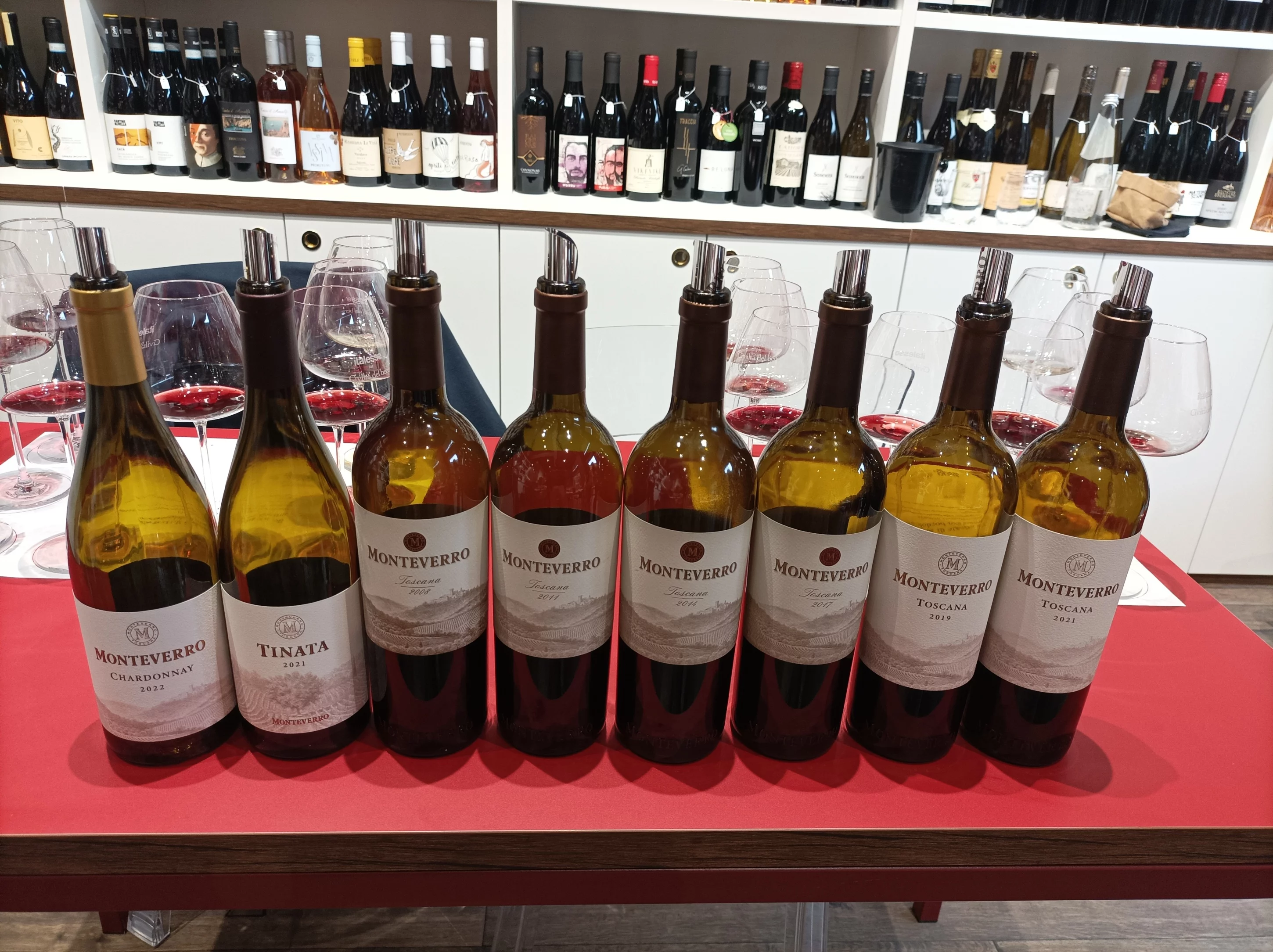 Prima di assaggiare le diverse annate di Monteverro, sono stati degustati anche lo Chardonnay Toscana Igt 2022, rotondo e armonico e il Toscana Rosso Igt Tinata 2021 (70% Sirah e 30% Grenache) floreale e speziato.