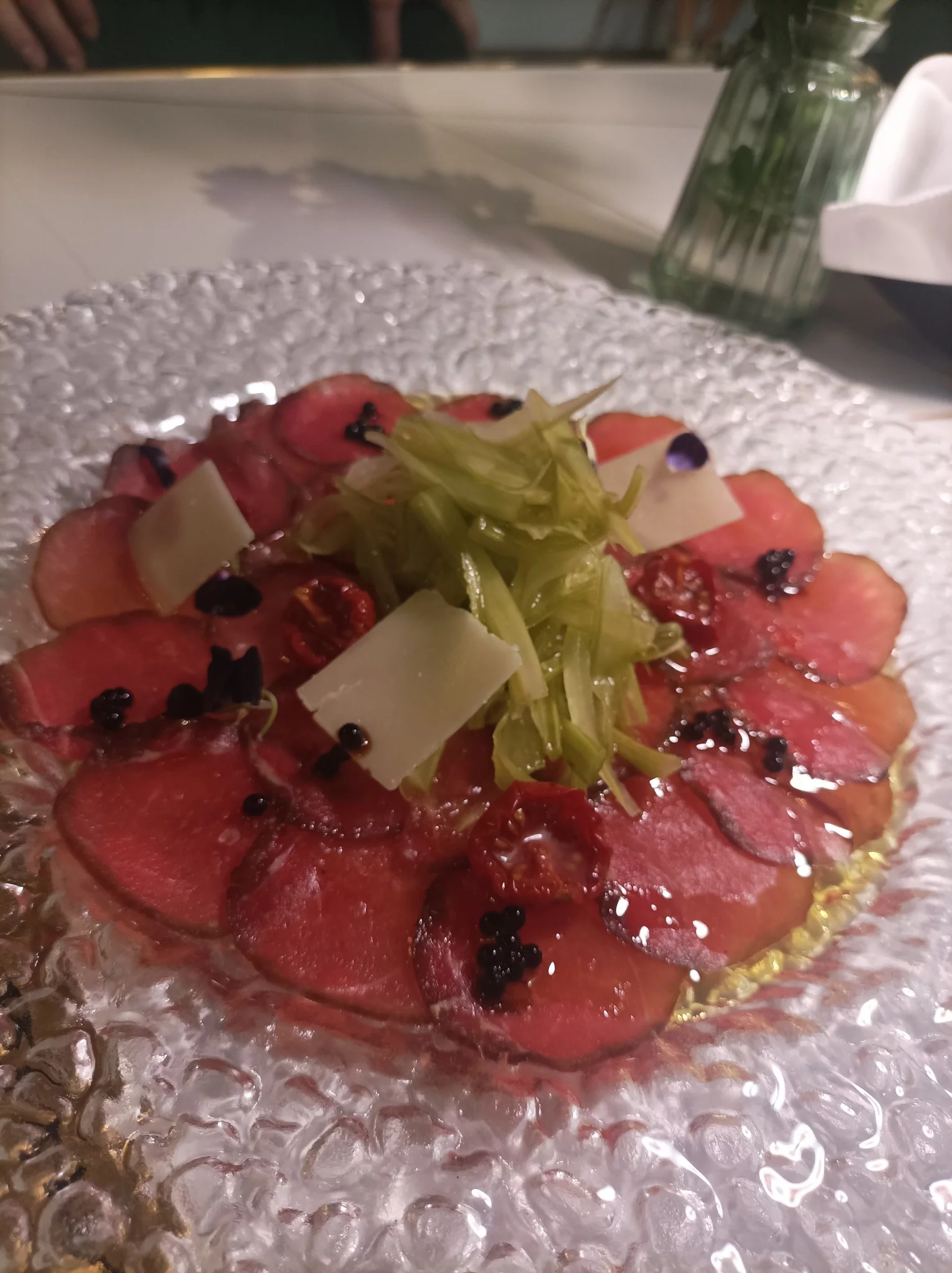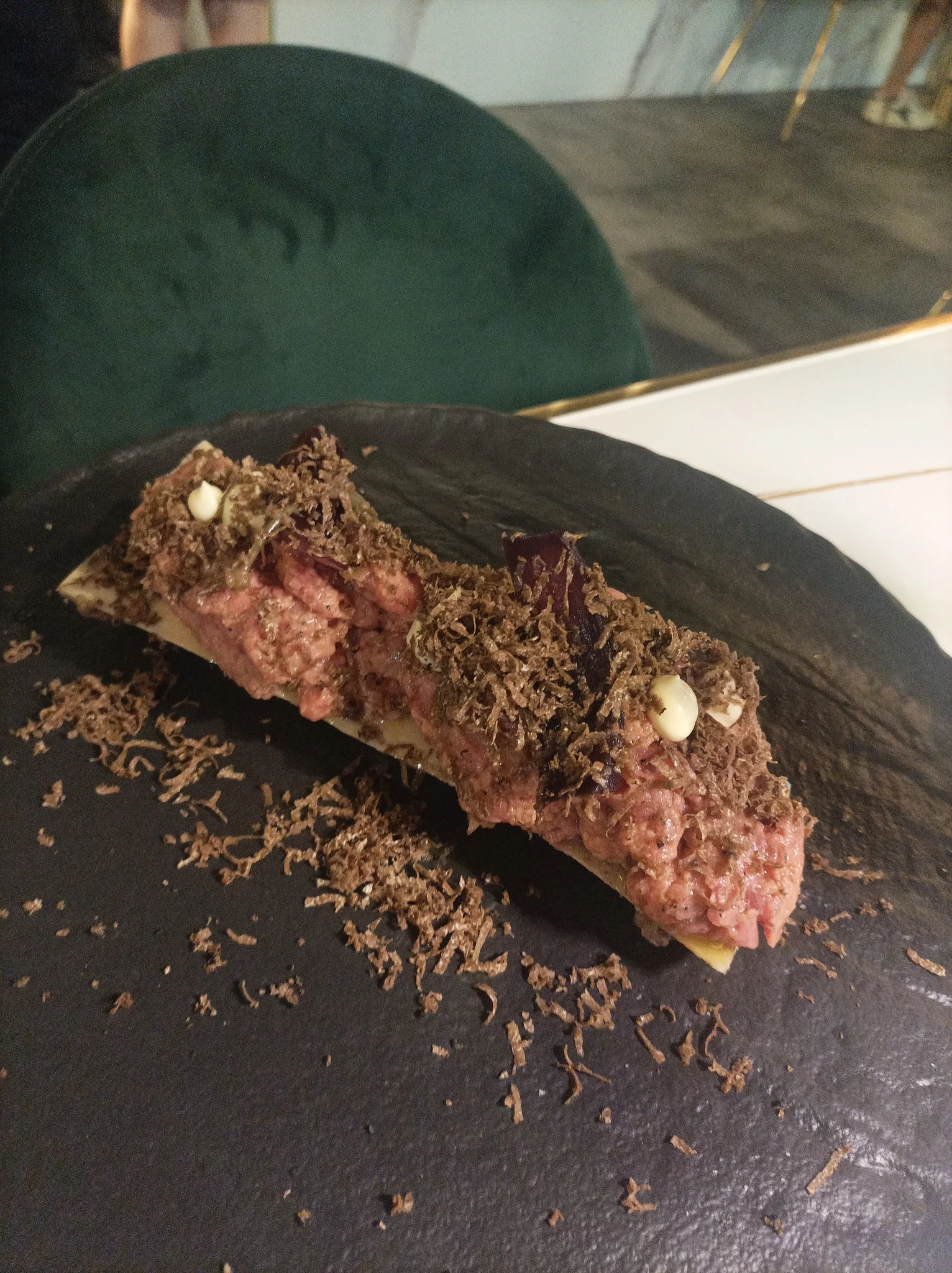 - prima con la Tartare di Scottona condita con fiori di cappero, cetriolino sottaceto, scalogno, senape, scorza di limone, olio, sale, pepe, barchetta di femore arrosto, maionese al finocchietto, lamelle di tartufo e cipolla rossa in agrodolce, con il Franciacorta Rosè di Centenari,